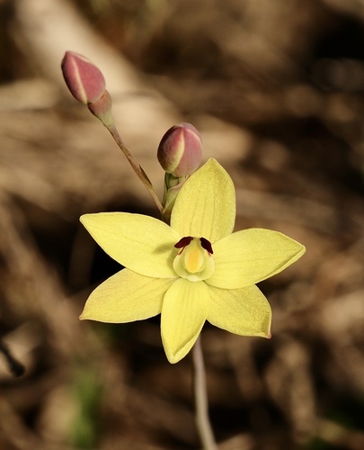 圖片取自 iNaturalist Australia 兔耳蘭是一種塊莖多年生草本植物,株高10-25厘米,7月至10月開黃色花朵。葉片橫斷面呈圓形,長5-12厘米,寬2-3毫米。花序由1-4朵黃色小花組成,花梗纖細,鋸齒狀,常帶粉紅色。每朵花直徑20-40毫米,散發檸檬或香草的香味。萼片和花瓣長12-20毫米,寬4-6毫米,萼片外表面有一條寬闊的紅褐色帶。花蕊長 5 至 6 毫米,寬 2 至 3 毫米,其耳狀的深褐色分枝高高聳立於花蕊之上。與其他同屬植物一樣,它透過種子繁殖,但其獨特之處在於,它是少數幾種能在匍匐莖狀根的末端長出塊莖的植物之一,從而能夠形成新的群落。花朵由昆蟲授粉,即使在涼爽的日子裡也容易開放,且花期較長。